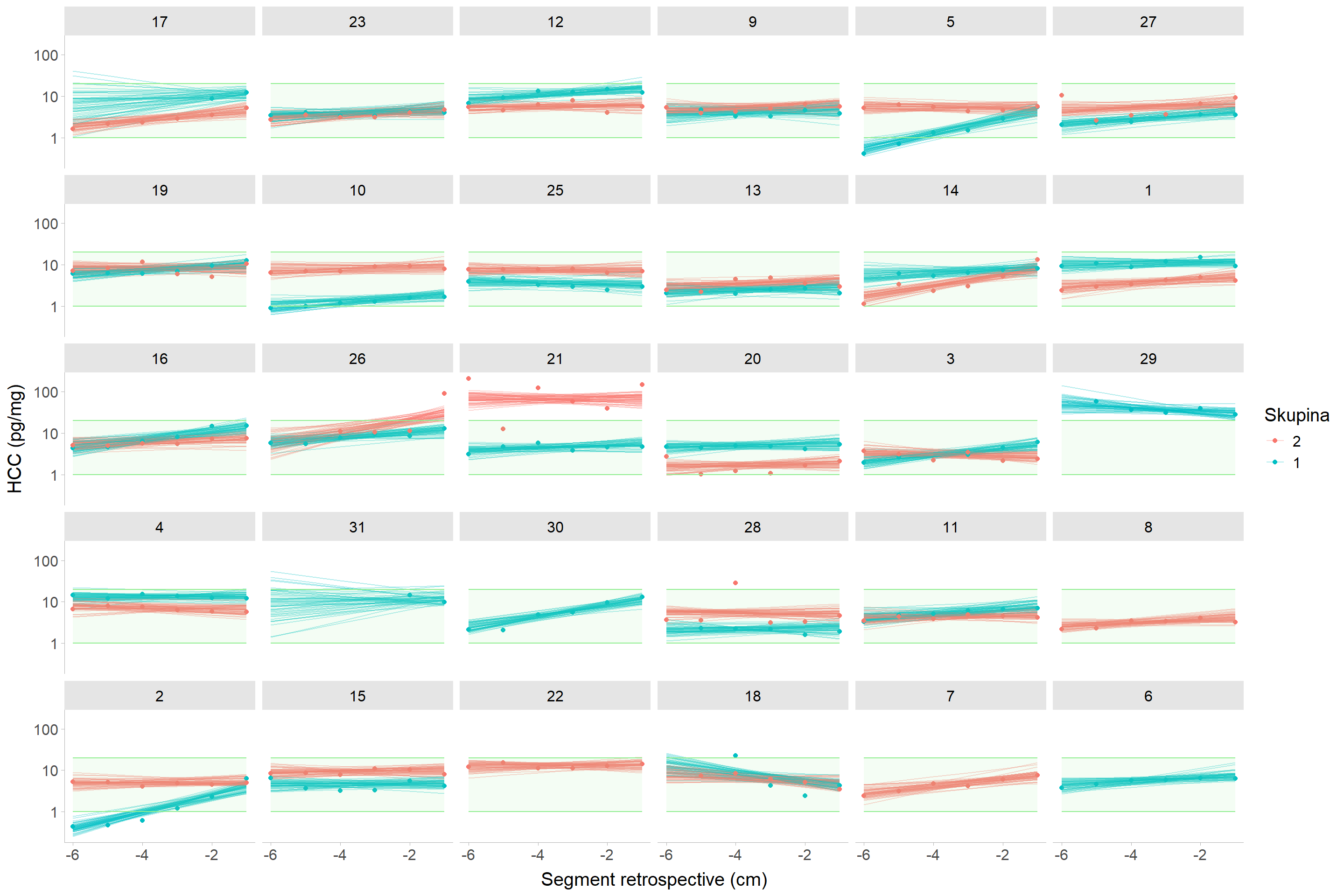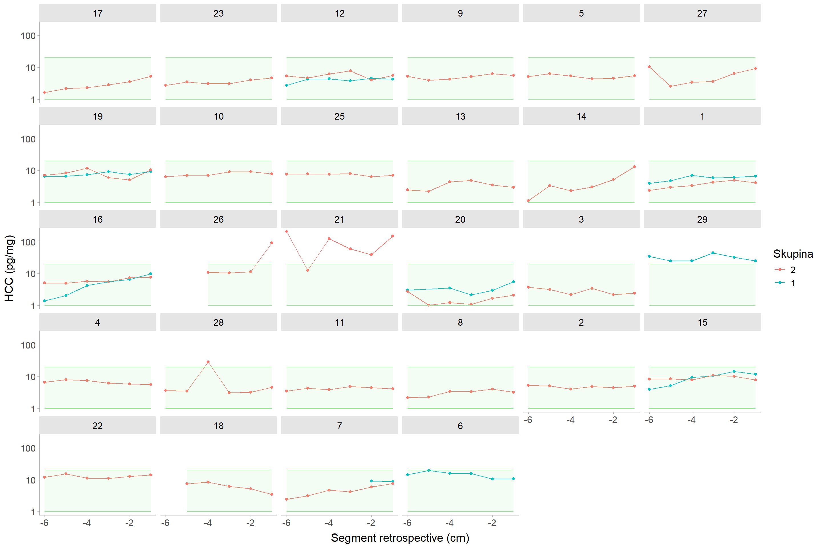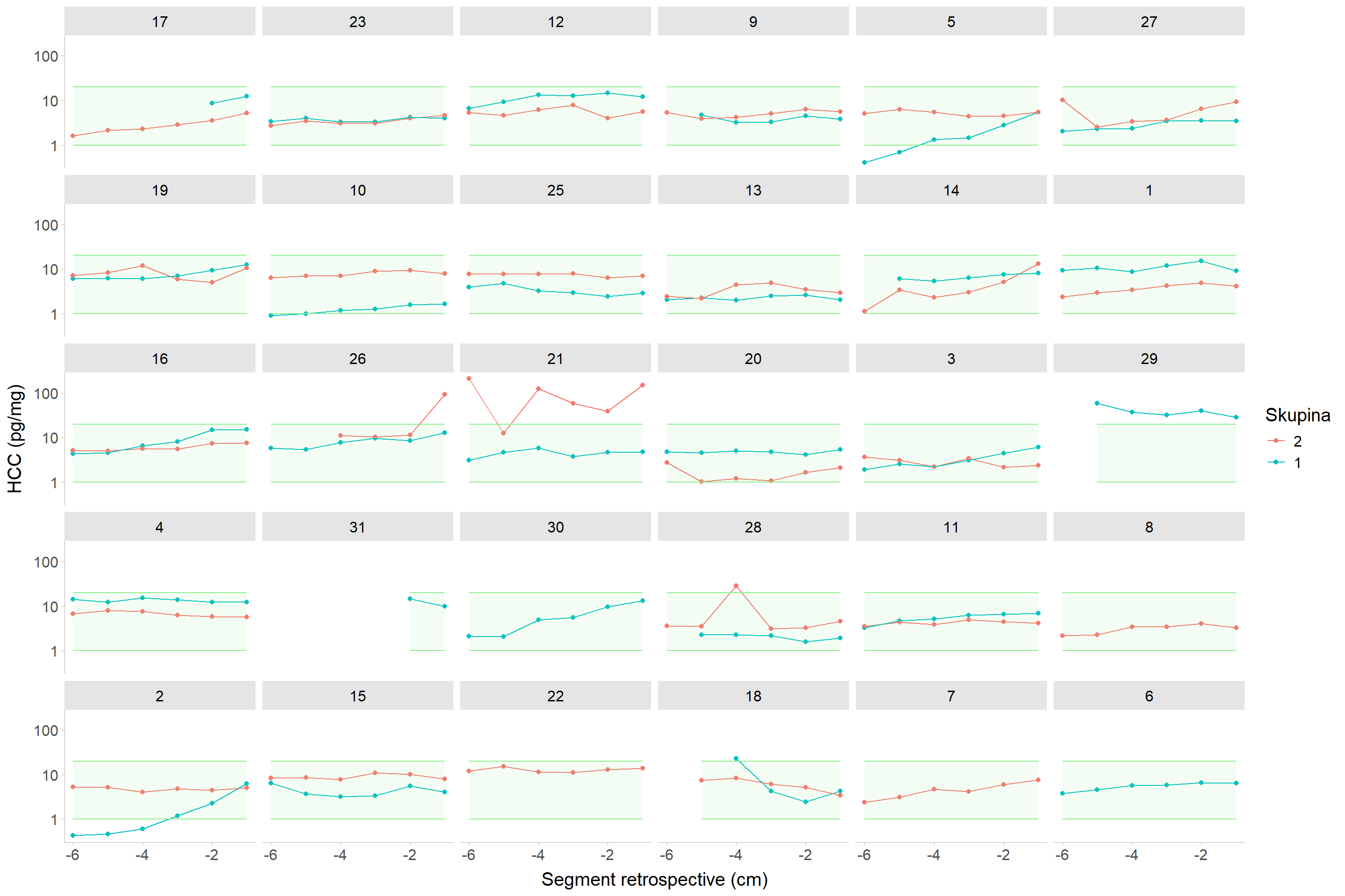 Díky párovaným jedincům je možné zobrazit porovnání skupin schizofrenie vs. kontroly jako segmentovaný vlasový kortizol (@fig-fig1). I bez použití modelu je zřejmé, že se skupiny nejenže mezi sebou neliší relativně, ale také nevybočují z absolutního (námi) udávaného referenčního rozmezí 1--20 pg/mg.