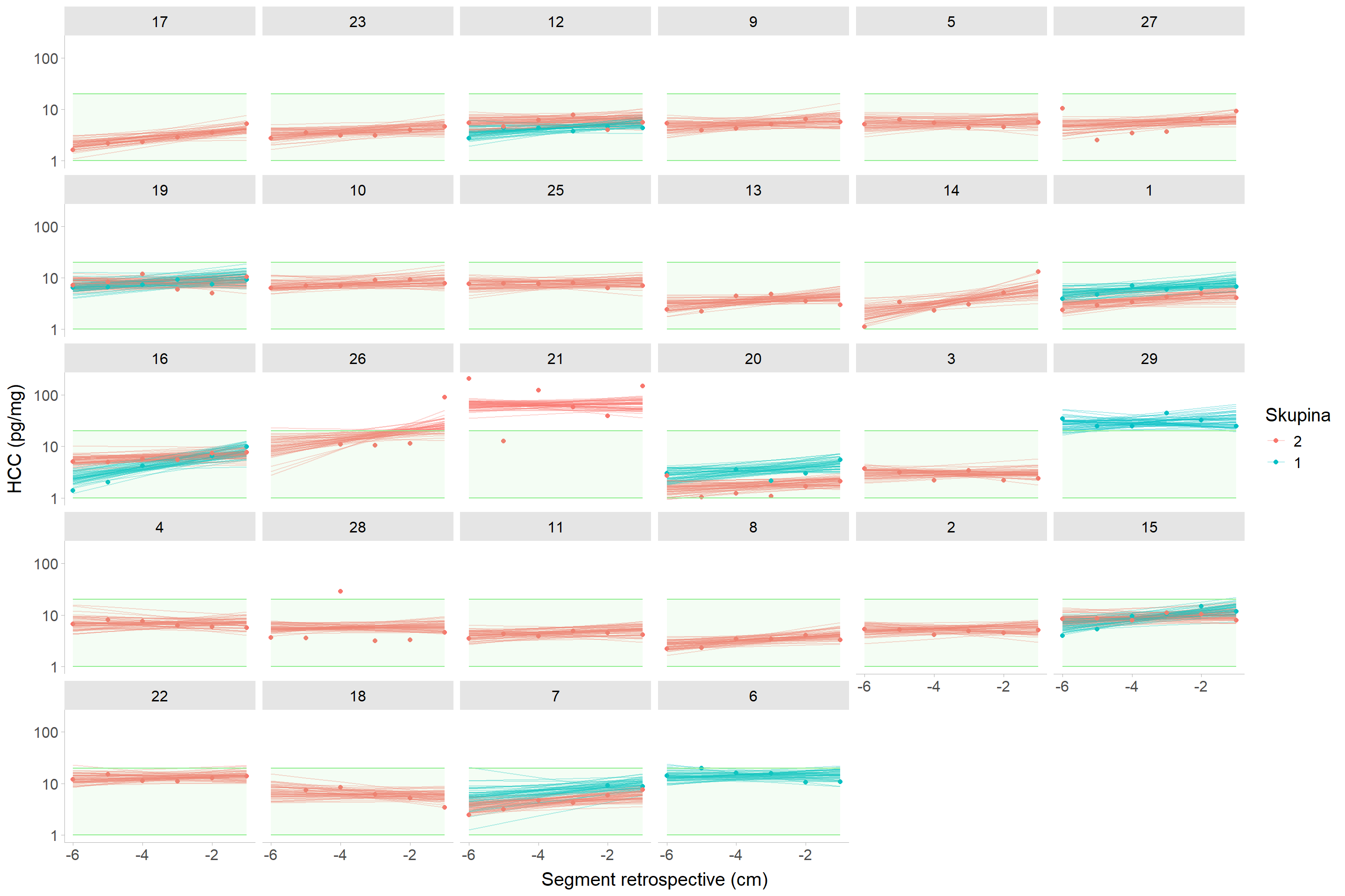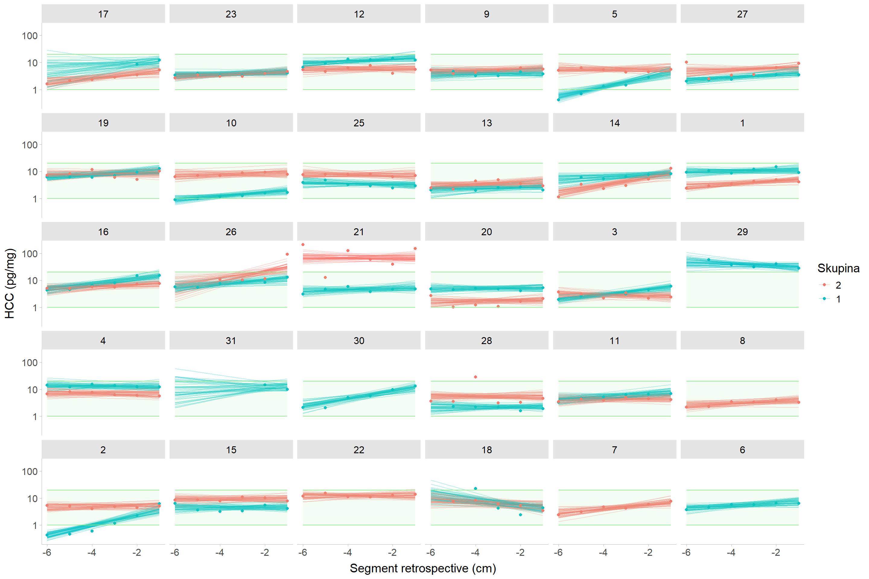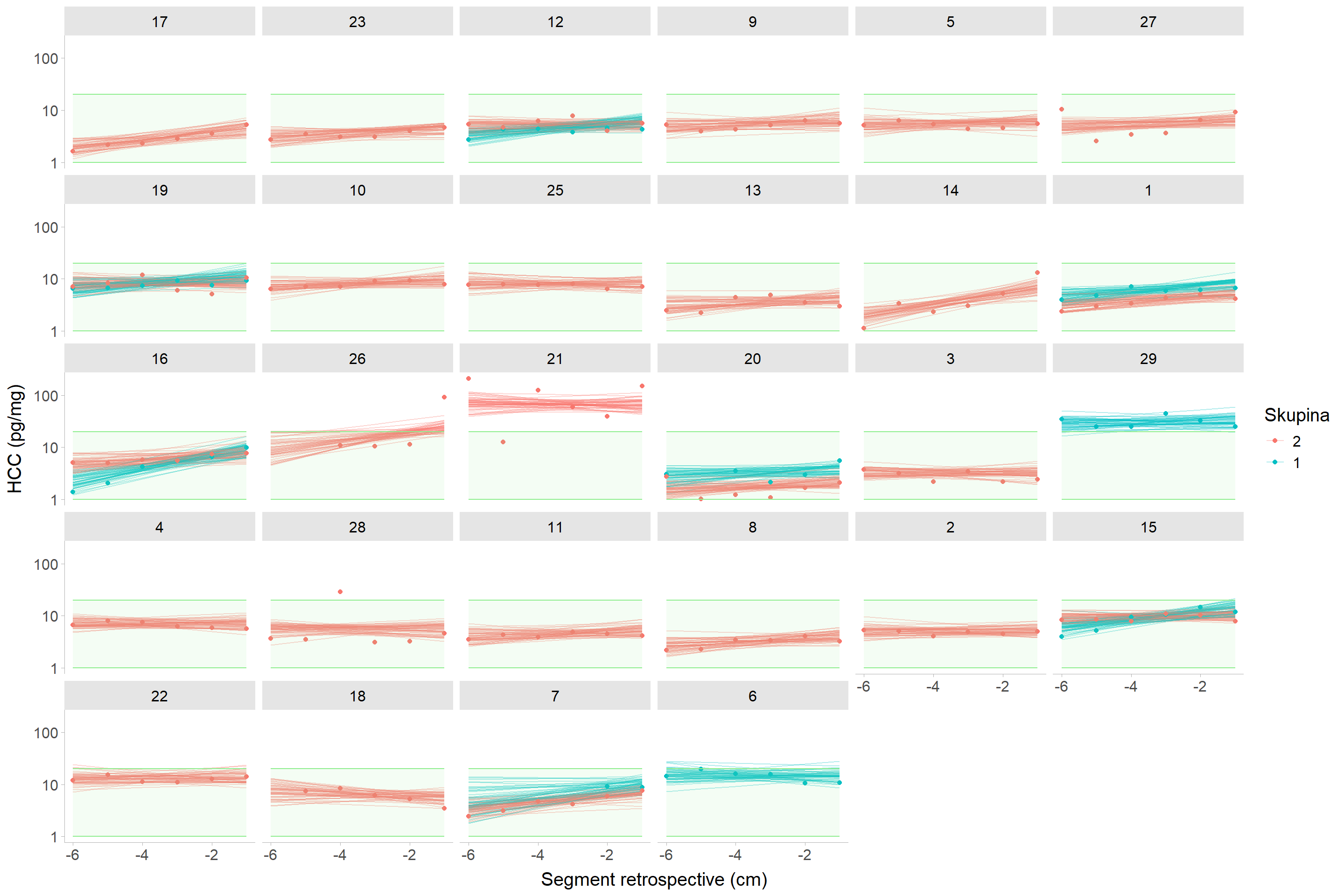 Díky párovaným jedincům je možné zobrazit porovnání skupin schizofrenie vs. kontroly jako segmentovaný vlasový kortizol (@fig-fig1). I bez použití modelu je zřejmé, že se skupiny nejenže mezi sebou neliší relativně, ale také nevybočují z absolutního (námi) udávaného referenčního rozmezí 1--20 pg/mg.